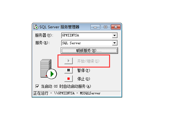 开始——运行——输入 sqlmangr  确定 ,再点击开始/继续的按钮,  下图 图标是绿色的 开始继续的按钮颜色是灰色的 表示数据库正常运行。