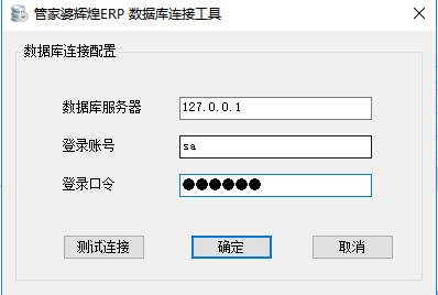 2、打开【DBconfig.exe】程序后界面如下,在【数据库服务器】处输入安装数据库时录入的数据库实例名(默认情况下为127.0.0.1,如果在安装数据库时没有特意修改数据库实例名称一般填写127.0.0.1即可),在【登录账号】处输入数据库sa账户,在【登录口令】处输入安装数据库时设置的数据库密码。
