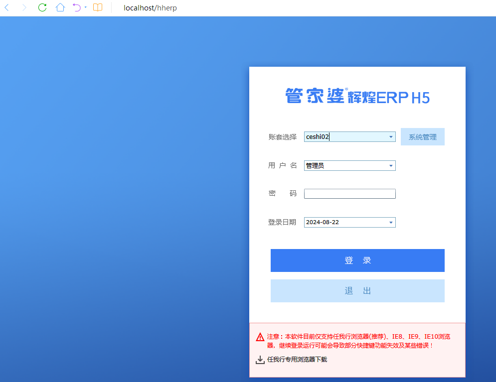 4、打开桌面上的登录图标,或者在浏览器中输入默认访问地址http://localhost/hherp即可进入软件登录界面。