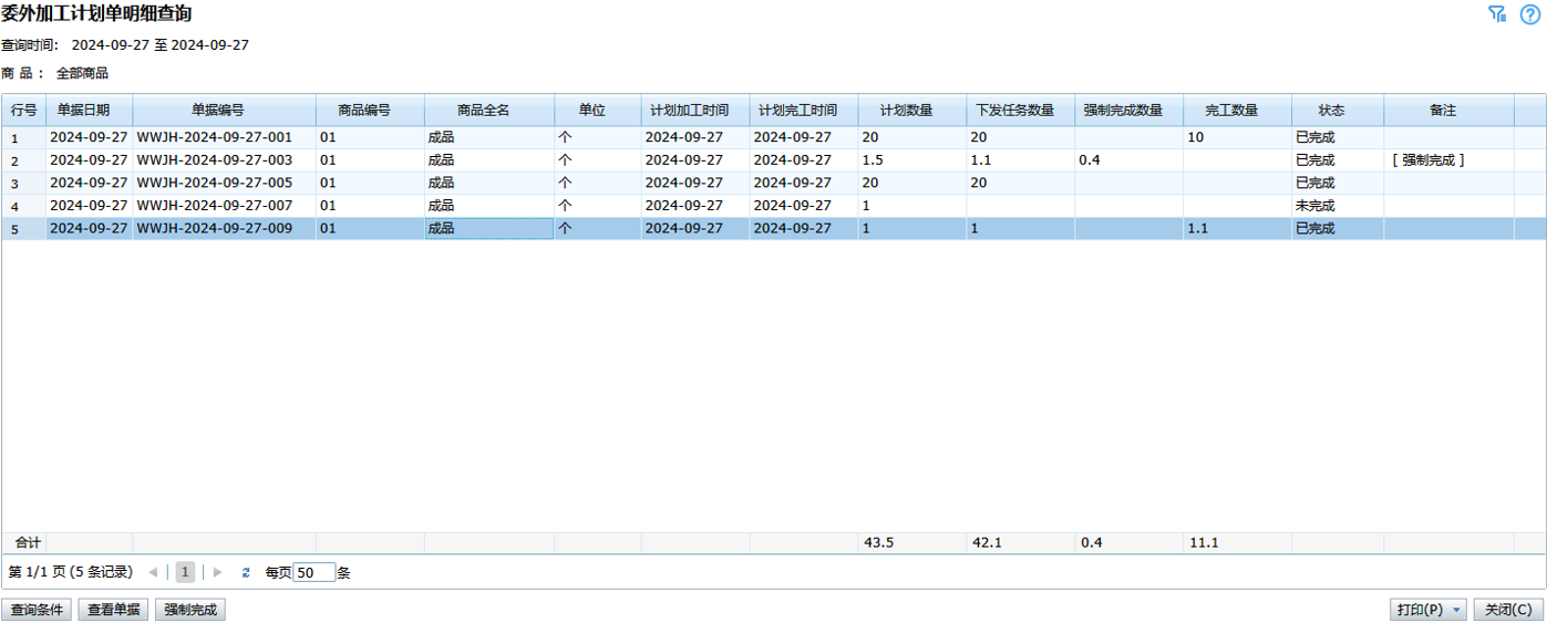 强制完成:可对委外计划生产商品未下单完成的商品进行强制完成,强制完成后,此商品则不能再进行下发委外任务单或是被委外任务单调用,强制完成将会针对选中的这一行明细执行,点击后此行的状态将从“未完成”更改为“已完成”,且备注会自动加上“【强制完成】”字样。