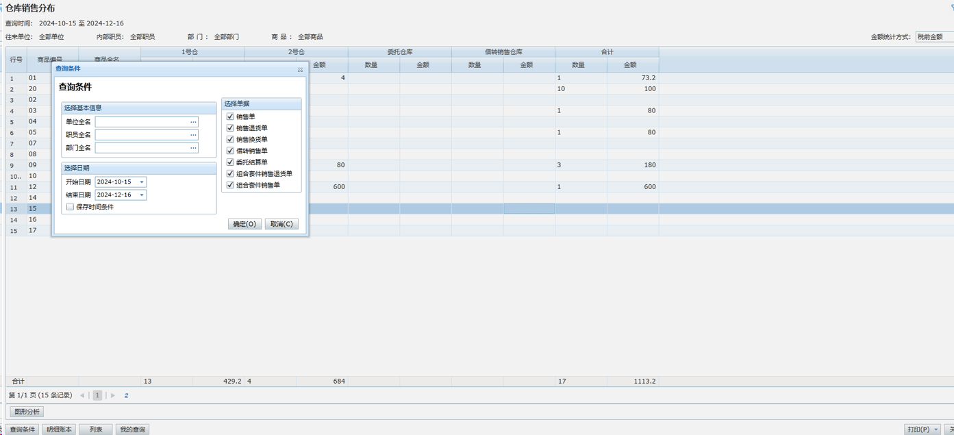 仓库需要在查询条件里面勾选具体的单据类型,不勾选单据类型的情况下不会显示数据,统计的单据类型有销售单、销售退货单、销售换货单、借转销售单、委托结算单、组合套件销售单、组合套件销售订单,计算模式:销售单数据减去销售退货单加上销售换货单换出部分商品数据-减少销售换货单换入商品数据加上借转销售单销数据加上委托结算单数据加上组合套接销售单销售数据减去组合套件销售单销售退货数据。表体是显示的商品在不同往来单位的销售数量和销售金额,金额显示根据上方选择的金额统计方式来显示,如果选择的是税前金额统计的是单据里面的 折后金额,金额统计方式选择的是税后金额统计的是单据里面的含税金额。金额不包括优惠,最左侧会显示出合计数量与合计金额。