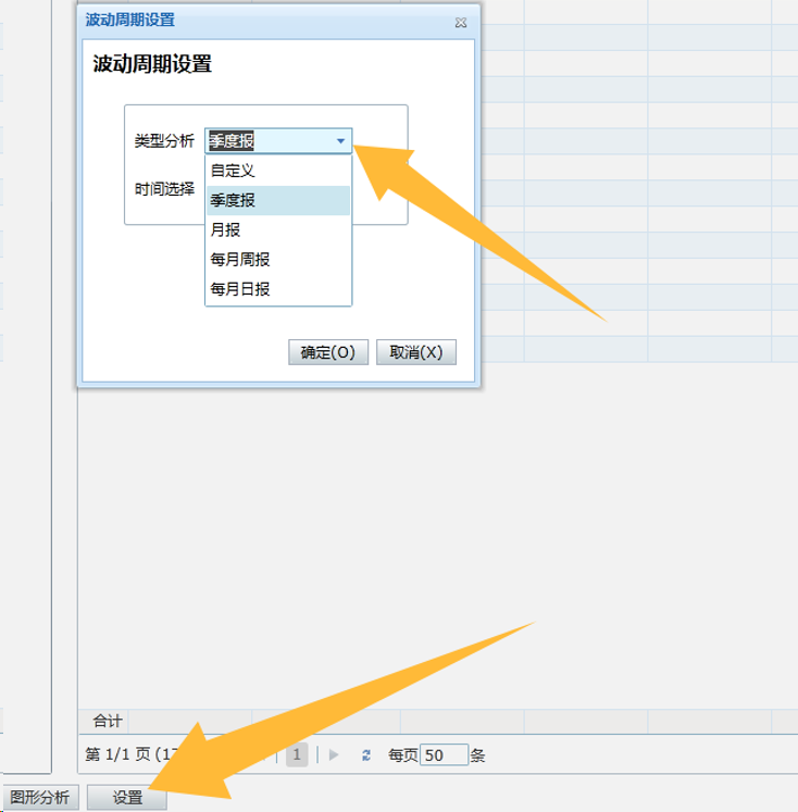 5、设置:是指波动周期设置,类型分析:自定义、季度报、月报、每月周报、每月日报。时间选择:是指选择具体的年份。