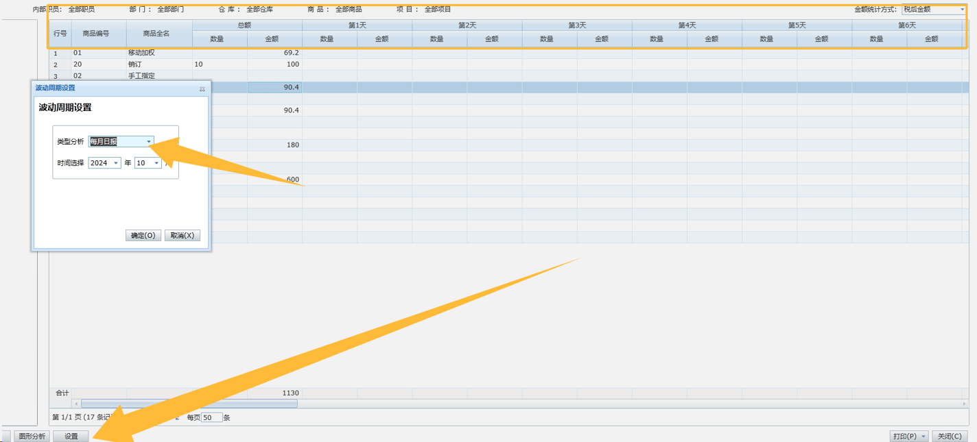 商品销售波动分析需要在查询条件里面勾选具体的单据类型,不勾选单据类型的情况下不会显示数据,统计的单据类型有销售单、销售退货单、销售换货单、借转销售单、委托结算单、组合套件销售单、组合套件销售订单,计算模式:销售单数据去销售退货单加上销售换货单换出部分商品数据-减少销售换货单换入商品数据加上借转销售单销数据加上委托结算单数据加上组合套件销售单销售数据减去组合套件销售单销售退货数据。报表表体是根据下方【设置】按钮设置的波动周期来显示的,金额显示根据上方选择的金额统计方式来显示,如果选择的是税前金额统计的是单据里面的 折后金额,金额统计方式选择的是税后金额统计的是单据里面的含税金额。金额不包括优惠。