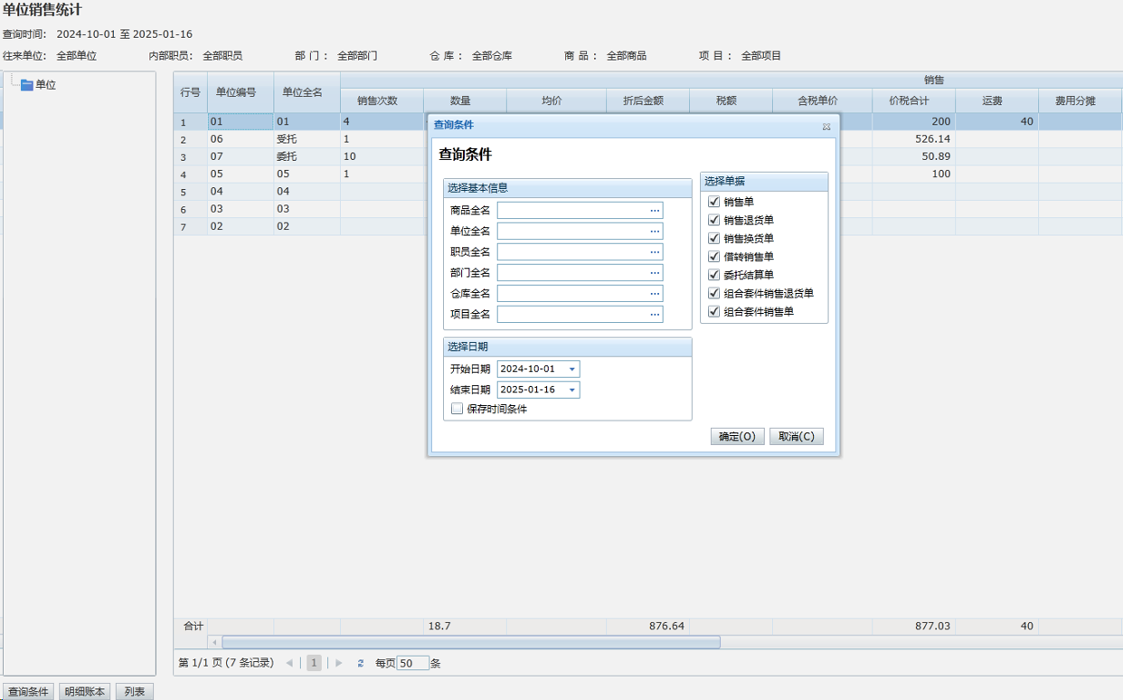 单位销售统计,可以查询往来单位在时间范围内在不同销售业务模式下面的销售、销售退货和实际销售数据情况,按照单位信息排列显示,此报表可以查询过账单据数据,不会统计被红冲被删除的单据。