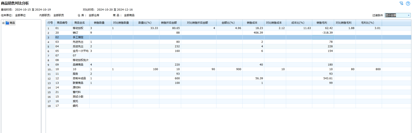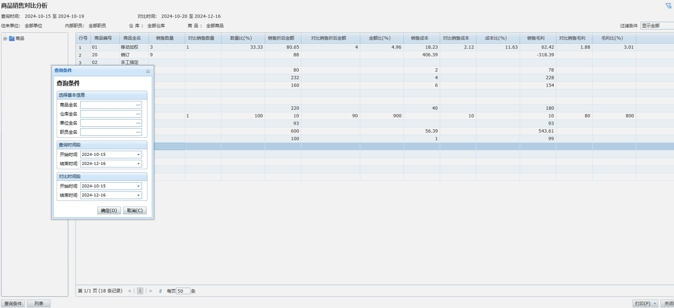 商品销售对比分析主要用于将两个时间段内的商品销售情况进行对比统计,可以显示查询时间范围 和对比查询时间的商品 销售数、对比销售数量、销售比、金额比、成本比、毛利比在多年账情况下,还可以将不同年份的同一时间段的商品销售进行对比分析。