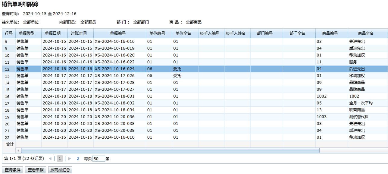 销售单明细跟踪可以按销售单往来单位、职员、部门和单据编号查询到一段时间内销售单里面每一行明细商品的销售、结算、开票、发货和拣货的情况,此报表是辉煌 erp15.0 开始新增的,辉煌 II 、云辉煌 II 还不支持。