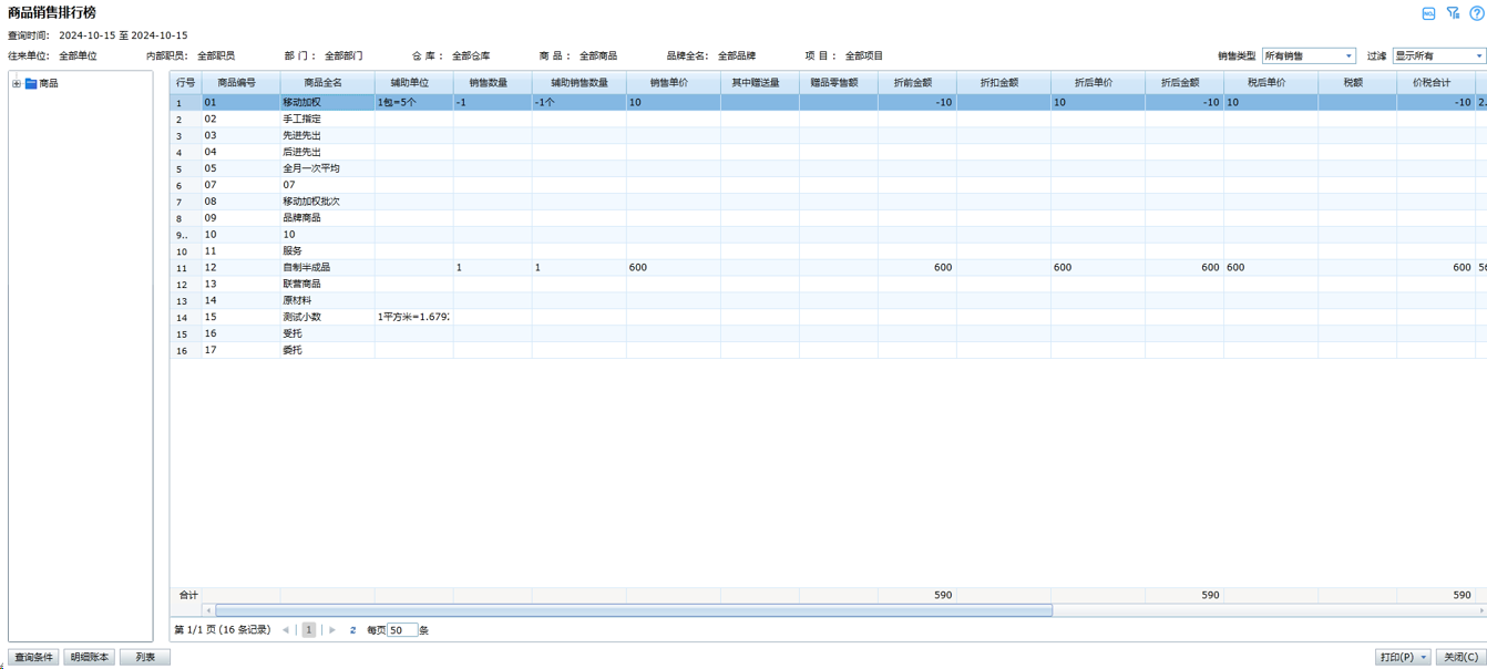 5、辅助销售数量:统计了商品在查询时间范围内,销售类单据的数据,具体计算公式 销售单数量减去销售退货单加上销售换货单换出部分商品数量-减少销售换货单换入商品数量加上借转销售单销数量加上委托结算单数量加上组合套接销售单销售数量减去组合套件销售单销售退货数据的辅助数据合计如果商品有多个计量单位,计算混合单位的数量情况。