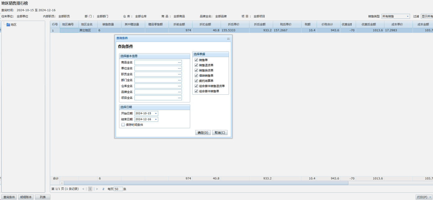 地区销售排行榜表体需要在查询条件里面勾选具体的单据类型,不勾选单据类型的情况下不会显示数据,统计的单据类型有销售单、销售退货单、销售换货单、借转销售单、委托结算单、组合套件销售单、组合套件销售订单,销售数量 计算模式:销售单数量减去销售退货单加上销售换货单换出部分商品数量-减少销售换货单换入商品数量加上借转销售单销数量加上委托结算单数量加上组合套接销售单销售数量减去组合套件销售单销售退货数据;如果是单据里面表头的购买单位在基本信息——单位信息里面没有设置地区信息,销售类的单据数据记入到【其它地区】里面。