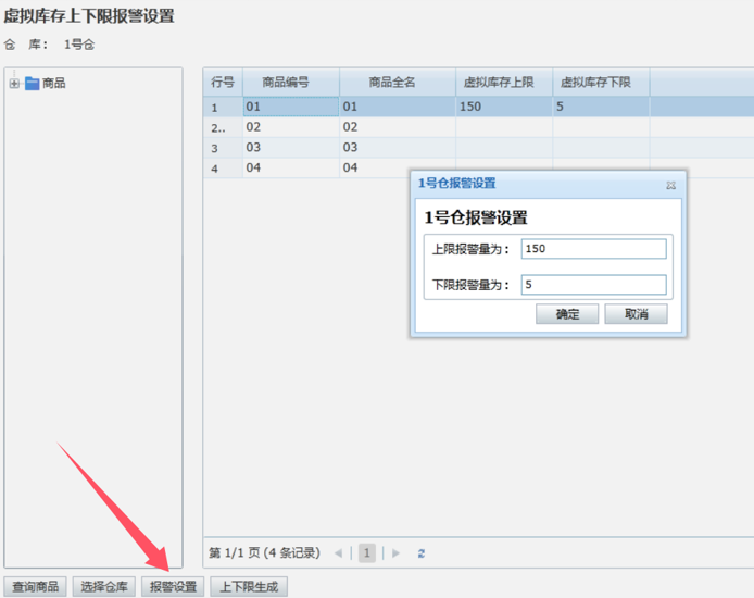 报警设置:选择仓库之后再去点击“报警设置”,会弹出报警设置框,手动输入对应的上下限数量,也可以双击对应商品设置;如果不选择仓库去点击“报警设置”按钮,会提示“请选择仓库”