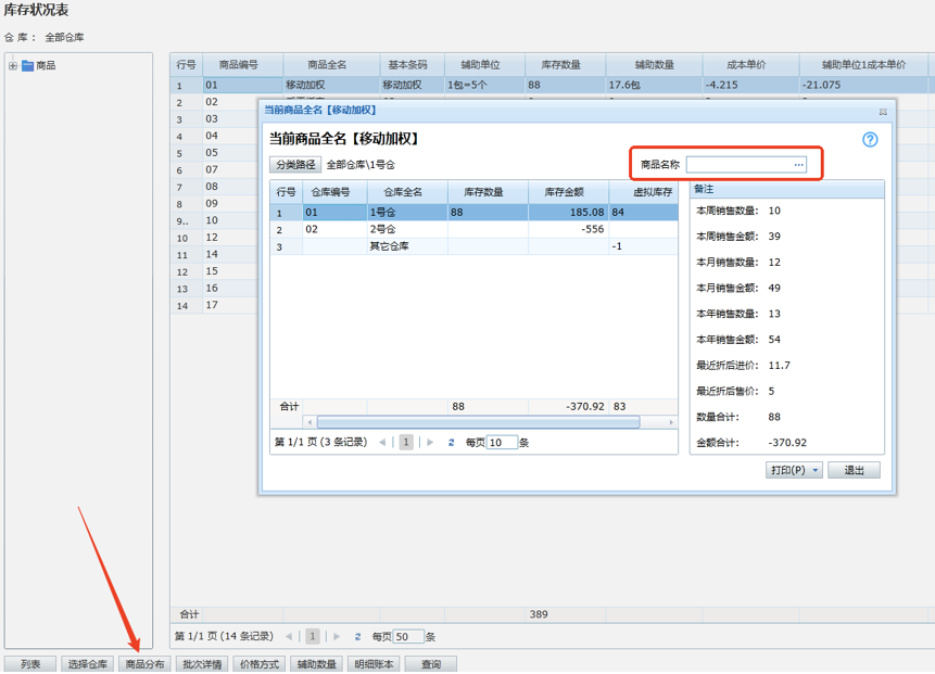 商品分布:默认显示对应选中的商品在各仓库中的库存数量和库存金额、虚拟库存数量分布情况;也可以在点击商品分布的界面右上角输入其他商品查询;金额之类受成本权限控制
