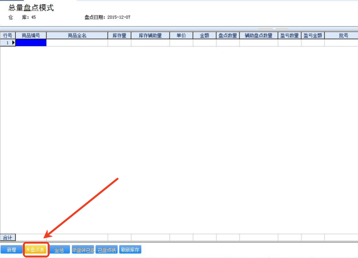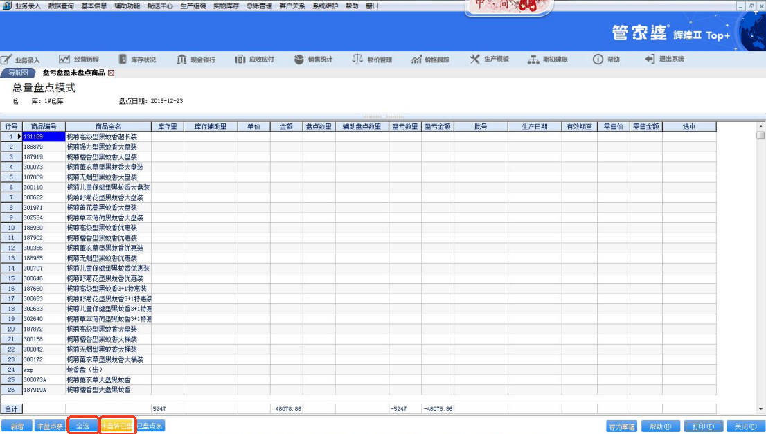 4、所有商品盘点数量都输完之后,点下面的【全选】按钮,然后再点击【未盘点转已盘】按钮。