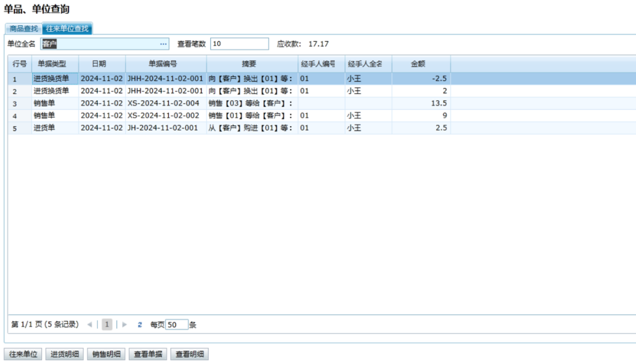 查看明细:就是查看一段时间里这个单位的应收应付情况。
