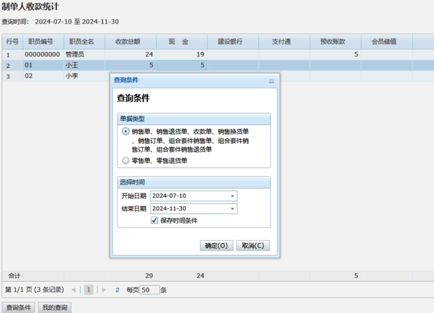 制单人收款统计可以统计选择时间段内,每个职员收取的现金、银行存款、会员储值以及预收账款、收款总额的情况。统计的单据包括销售类单据及零售类单据;如果涉及到的现金银行账户超过18个,则可以通过我的查询设置分组进行查询