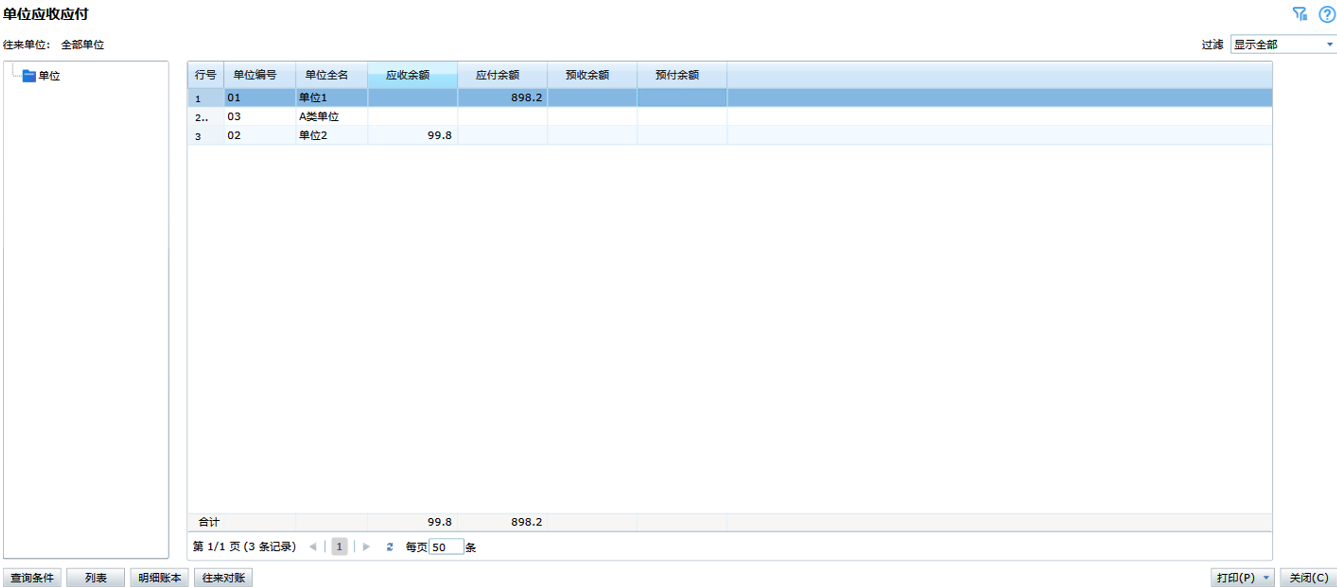 明细账本:可选择查询应收明细或应付明细,查询统计出某一时间段针对某一单位的每一笔影响应收应付的业务单据。