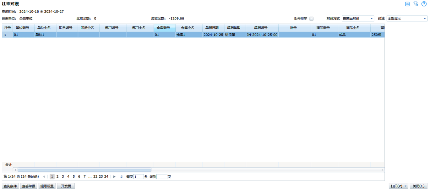 对账方式:往来对账支持按商品对账和按单据对账两种方式。不同的对账方式,表体中的字段显示也会不同。