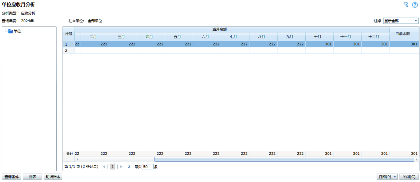单位应收月分析,用于分析往来单位年度内每月应收余额情况,便于与客户核对账目,以及分析与该单位业务情况。为企业衡量往来单位信用提供数据支持。