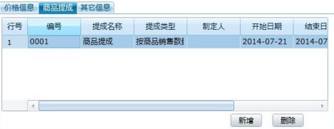 商品基本信息中的“商品提成”页面,主要显示的是该商品使用的提成方案的基本信息,如果名称、时间等等。选择方案后,系统将会根据商品的销售情况,统计职员的提成。点击“新增”按钮,可以在提成方案管理界面中选择新的方案;点击“删除”按钮,可以删除该商品对应的方案,但并不会删除提成方案本身。