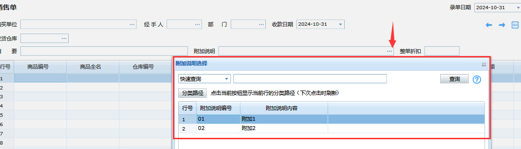 在基本信息—附加说明中建立了“附加说明”信息后,在进行单据录入时,可以直接在附加说明的字段中选择保存后的附加说明,不需要再次手动录入,提高了录单速度。