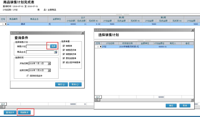 第三步:查询制定计划的完成度,辅助功能----销售计划----商品销售计划完成表,选择销售计划单(必须),商品全名(可选项)不选择表示全部,选择时间以及单据类型,点击确定可查到每期的计划总额、完成总额和完成率。如需知道这个数据是怎么产生的,点击左下角的明细账本查询。