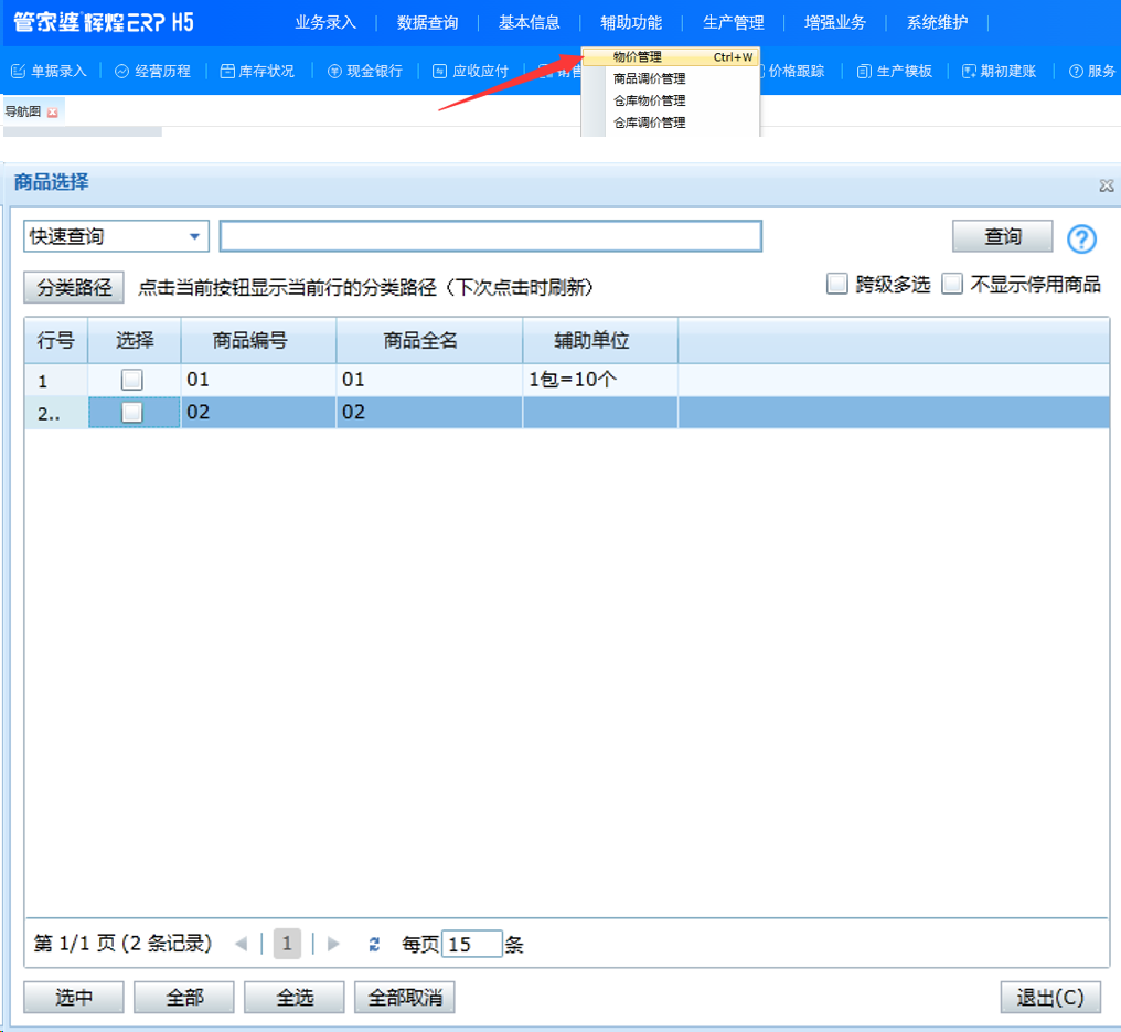 操作:菜单“辅助功能-物价管理模块”;打开辅助功能-物价管理之后默认会弹出商品选择框【注:普普版没有此模块】