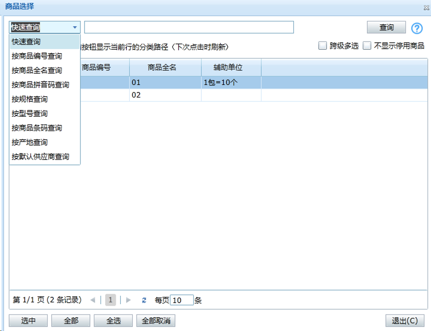 快速查询:根据对应关键字或者相关信息查询商品(包含以下信息:按商品编号查询、按商品全名查询、按商品拼音码查询、按规格查询、按型号查询、按商品条码查询、按产地查询、按默认供应商查询)