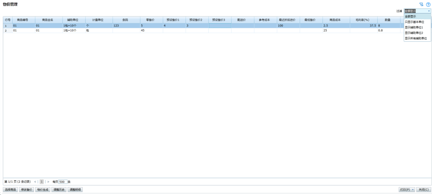 物价管理是对软件中商品物价进行管理的功能,可以支持修改、查询、维护各商品的零售价、预设售价、配送价、参考成本、最近折后进价、最低售价,以及系统维护-价格体系-价格信息设置里增加的自定义价格。