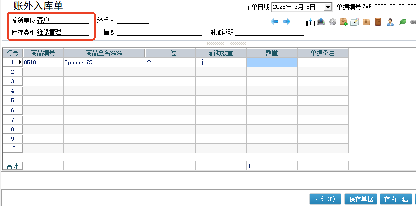 2、打开账外入库单,输入发货单位(也就是送来维修的客户)以及库存类型,库存类型在处理该业务时很重要的;单据录制完成后过账