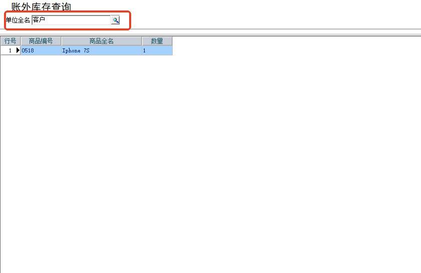 3、打开账外库存查询就可以选择对应的单位全名(送来维修的客户),就可以看到库存数量。这个数量是针对对应客户的,不是对应的客户是查不到数量的;例如张三送来一部Iphone 7S维修,查询李四就没有库存数量
