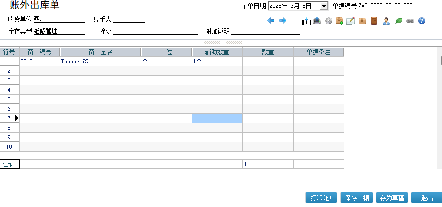 5、维修完成后做一张账外出库单,需要注意的是账外出库单上的收货单位一定要选择送来维修的客户,如果客户选错了,单据过账时会提示【库存不足】