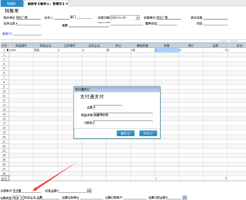 2、在销售/零售单结算时,选择支付通账户进行结算,录入收款金额,点击保存单据 (零售中点击确定)会进入如下支付通支付界面:在弹出的界面扫描客户那边的支付宝/微信付款码即可,如果扫码枪故障,也可以手动输入“付款码”。