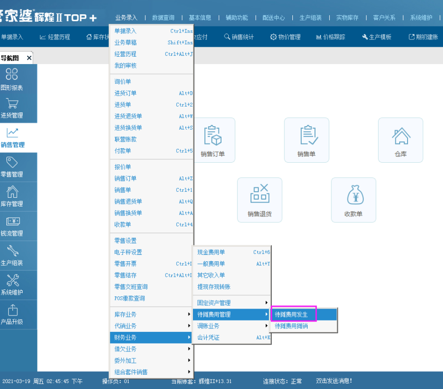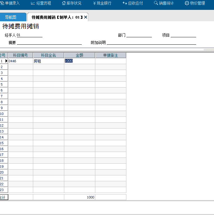 3、最后,就需要每个月做待摊费用摊销,业务录入——财务业务——待摊费用管理——待摊费用摊销,摊销的时候选择对应的这个【房租】费用科目,金额1000;