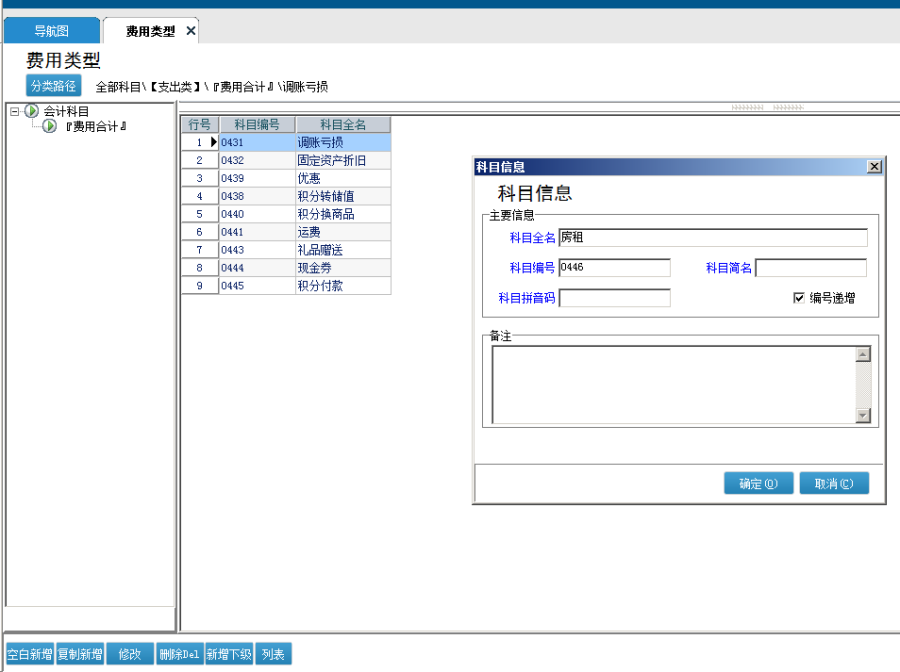 2、然后基本信息——费用类型里,添加一个房租的费用科目
