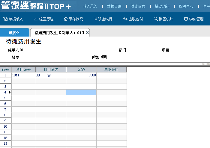 1、首先,我们需要先做一张待摊费用发生:业务录入——财务录入——待摊费用管理——待摊费用发生,选择现金/银行科目,录入付款的6000元;单据过账后,资产负债表里【待摊费用】科目就会增加6000元的金额;