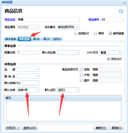 1、设置步骤:先在商品信息卡片的其它信息中,我们可以设置每个商品的默认仓库和默认货位。这样一来,当我们在单据上选择这个商品时,系统会自动带出设置好的默认仓库和默认货位。省去了手动选择仓库和货位的步骤。如下图(注意:在启用了货位管理的情况下才会显示默认货位,没有启用货位的情况只录入默认仓库即可)。