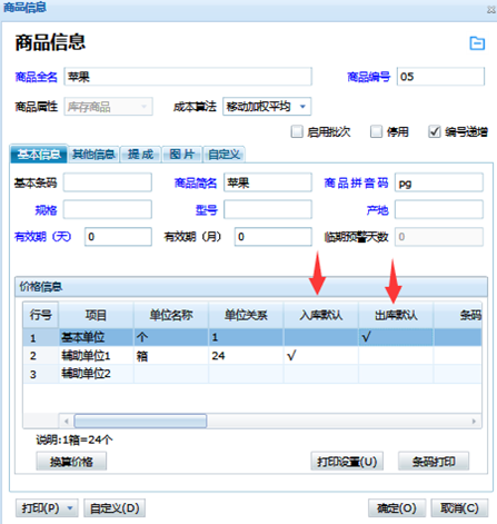 在商品信息卡片中增加了入库默认和出库默认两个字段,我们可以根据实际情况勾选,比如入库默认单位为箱,出库默认单位为个,如图: