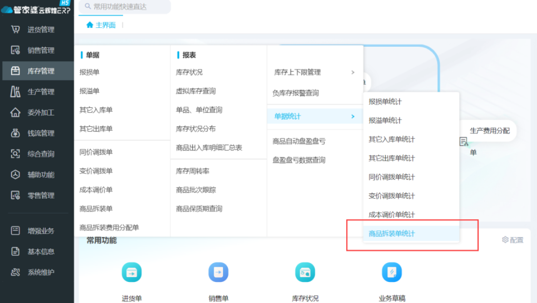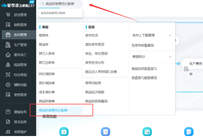 功能位置:单据位置在库存管理-商品拆装费用分配单,也可以通过左上角的搜索框快速搜索打开。