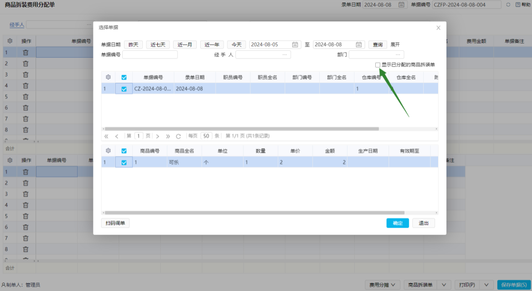 拆装单是指商品拆装单,费用单是指 一般费用单和现金费用单,打开商品拆装费用分配单点击右下角按钮,下拉选择调用“商品拆装单/费用单”,商品拆装单支持多次调用分摊,已经分配过的单据,勾选显示已分配的商品拆装单 ,就可以再次调用,费用单已经分配过了金额分配完了不支持多次调用。
