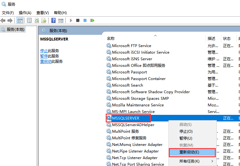 1、先右键我的电脑---管理—服务,在服务里面重启一下SQL服务。