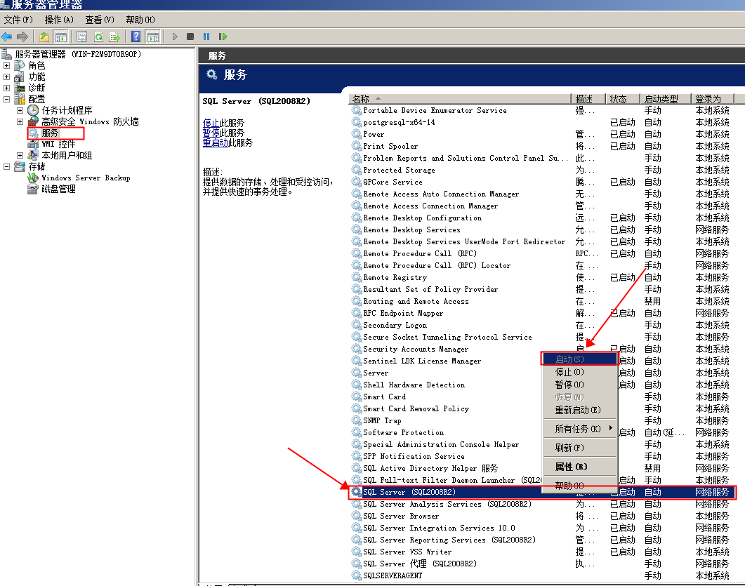 (1)在电脑桌面--我的电脑--右键,管理--左边找到服务--中间点击服务--将SQL Server开头的服务启动。
