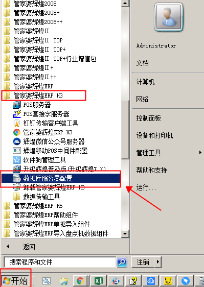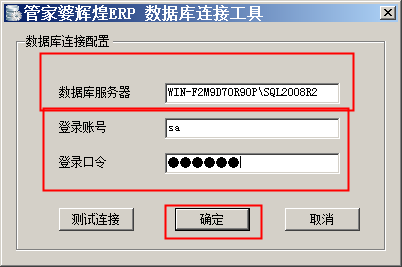 (2)开始-所有程序-ERP-数据库服务器配置 里面重新输入相关信息配置,然后点确定。