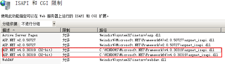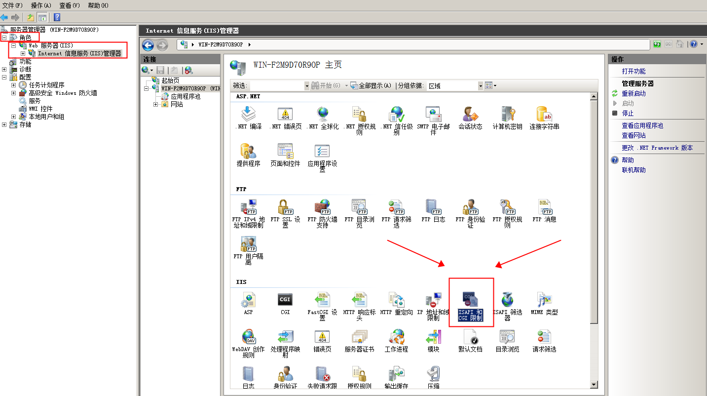4、打开IIS(我的电脑-右键-管理-角色-ISS),然后点开ISAPI和CGI限制