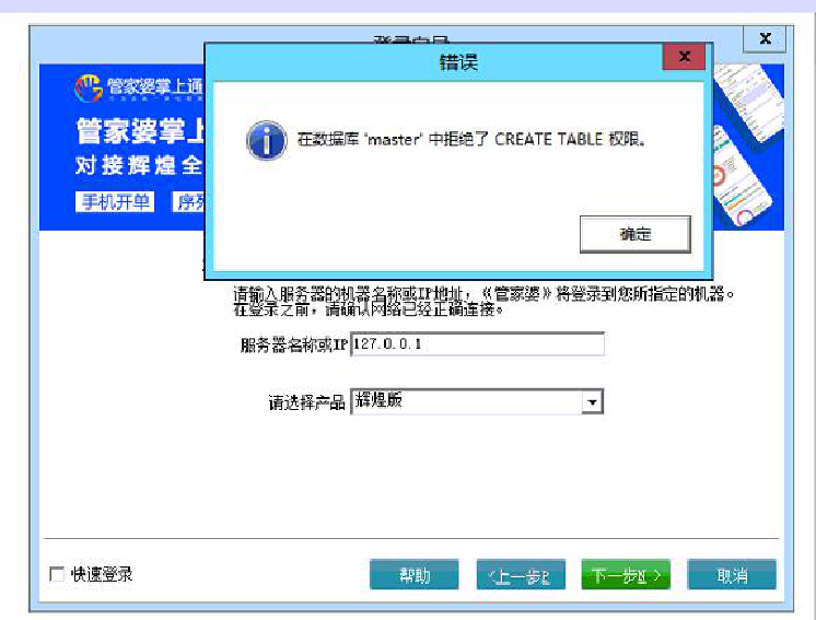 4.1.3.25、登录软件报错:在数据库‘master’中拒绝了CREATE TABLE 权限