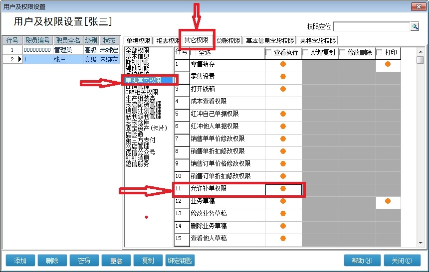 或者是授予操作员允许补单权限:系统维护——系统管理——用户及权限设置——其他权限——允许补单权限