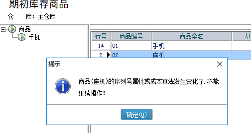 先打开了期初库存商品,然后再打开了商品信息去修改过成本算法或者序列号启用的属性,没有关闭,又直接在之前已经打开的期初库存窗口录的期初,这种由于窗口没有重新获取到信息,期初录入还是修改商品信息前的状态,就会有这个报错,关闭期初窗口后,重新打开录入即可。