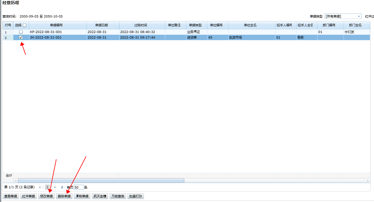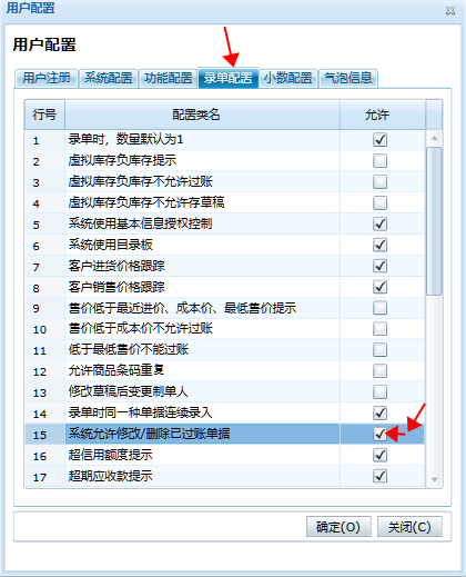 (1)在用户配置——录单配置里勾了允许修改删除已过账单据