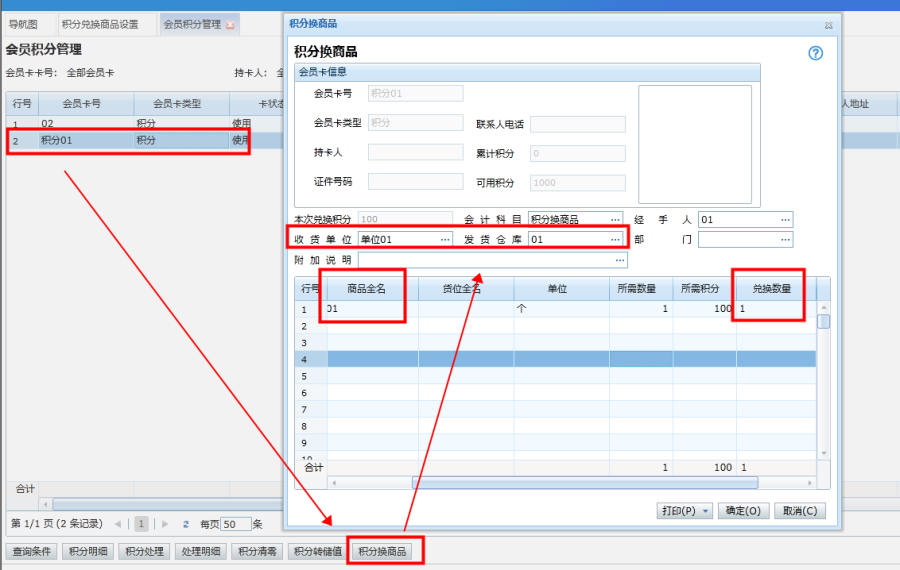 4、然后积分卡累积足够兑换商品的积分后,到辅助功能——会员卡管理——会员积分管理中,兑换商品,如下截图;打开会员积分管理后,先选中要兑换商品的会员卡,点击下方的积分兑换商品按钮,弹出的框里,设置好单位和仓库,选择对应的商品,录入兑换数量即可;