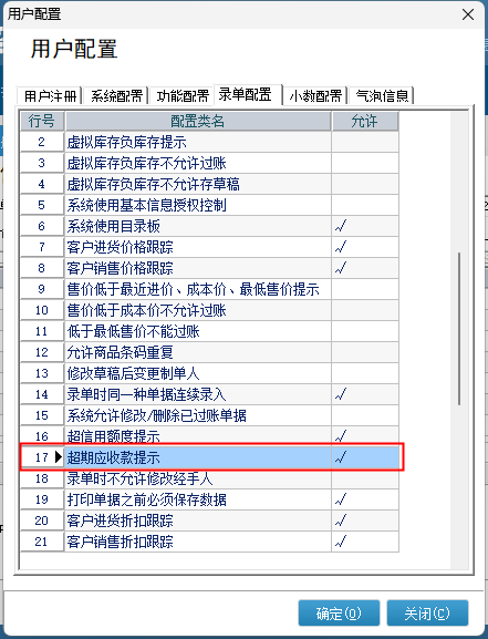 (2)如果需要在开单时提示,系统维护---系统管理—用户配置,勾选超期应收款提示