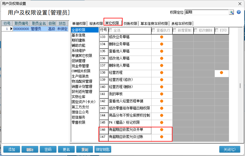 (3)如果要控制操作员超期就不能开单或者过账,参考图示设置不给对应的权限
