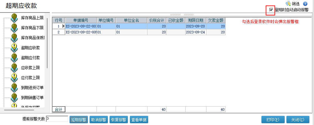 打开后界面如下面的第一张图,左下角可设置提前报警天数,比如今天是9月22号,第二行的单据的收款日期是9月24号,本应该是25号的时候会报警,那么这里把提前报警天数设置为3天,今天就会处于报警的状态