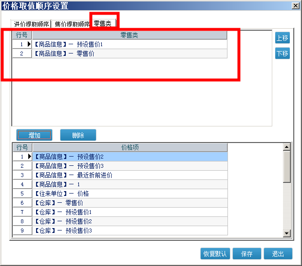 3、系统维护-价格体系-价格读取顺序,如果将零售类的价格读取顺序更改过,那么售价会默认读取最上面的价格,就不会直接读取零售价,导致零售价和售价有差异